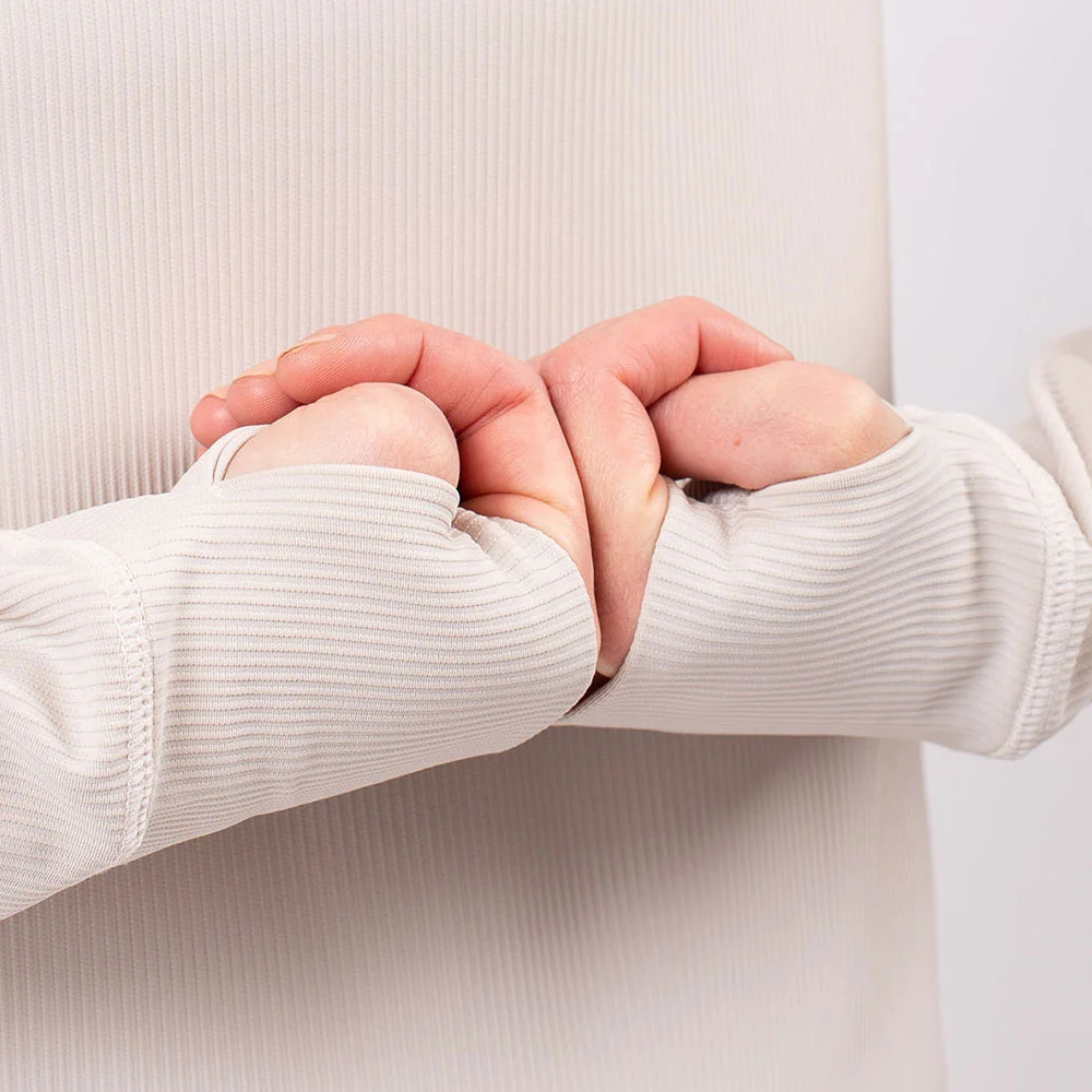 - doppellagige, anliegende Ärmelbündchen mit Daumenloch